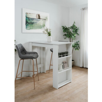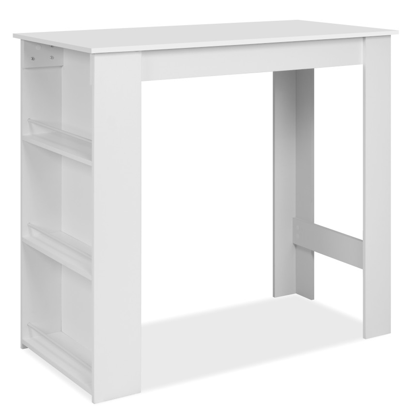 Baarilaua mõõdud teevad sellest praktilise valiku ka väiksematesse köökidesse või korteritesse. Laua vastupidavuse tagab melamiin kattega mööbliplaat ning see on saadaval erinevates viimistluses. Küljel olevad kolm riiulit pakuvad praktilist hoiuruumi. See on mugav lahendus hommikusöökideks, kiireks kohvipausiks või õhtusteks vestlusteks.