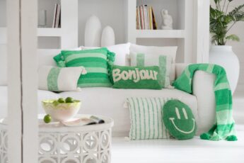 - Dekoratiivpadi puuvillast, kaunistatud Bonjour tepitud kujundiga