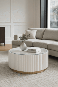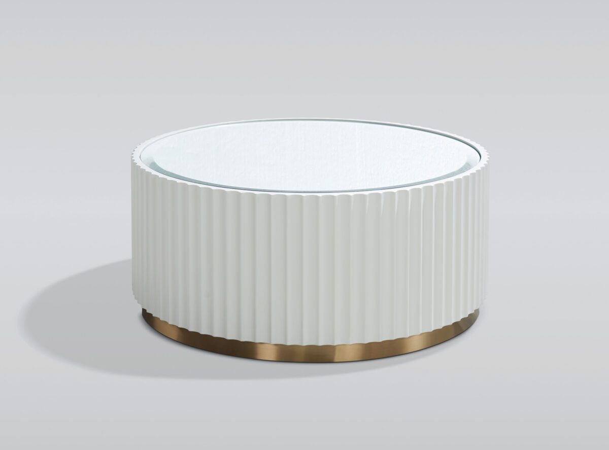 - Elegantne ümmargune diivanilaud ühendab määrdunudvalge ja kuldse sära