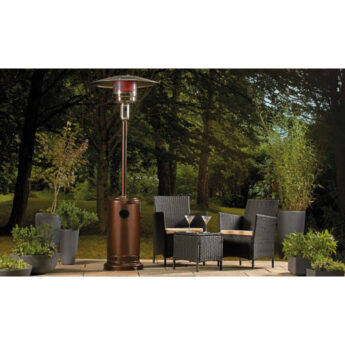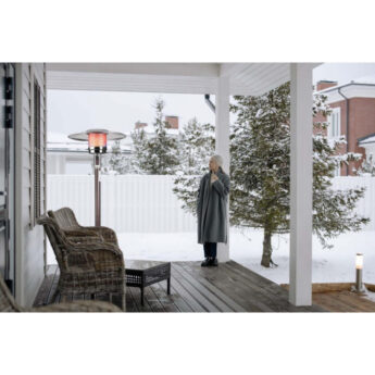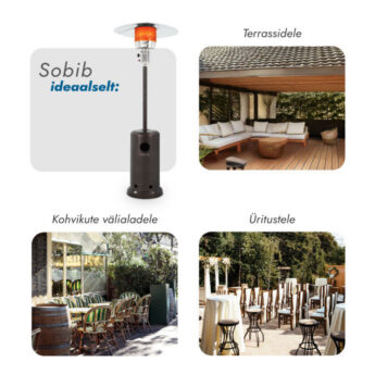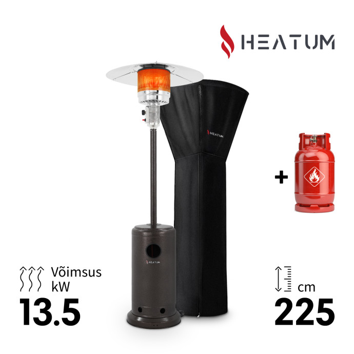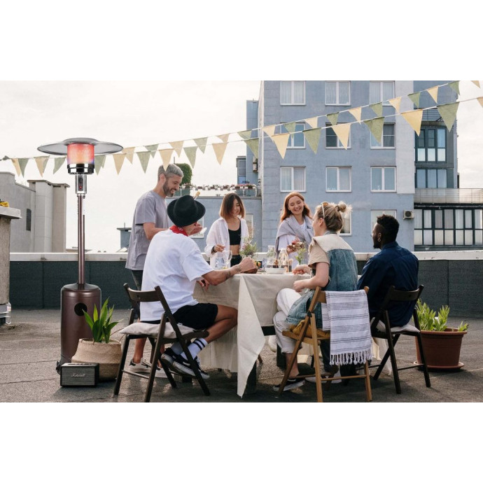 Vihmavarju/seene kujuga Heatum Redem gaasikütteseade on väga stiilne ja uuenduslik valik teie keskkonda. Need gaasiküttega väliskütteseadmed on valmistatud kvaliteetsest, vastupidavast ja kauakestvast pulbervärvitud terasest, seega peavad nad vastu aastaid kaotamata sealjuures oma esteetilist väljanägemist. Omapärane vihmavarju / seenekujuline disain annab elegantse ja luksusliku välimuse ning sinu üritusele või kodule lisaväärtust, mistõttu on need pruunid värvilised gaasikütteseadmed lemmikud pulmades, tähtpäevadel, restoranides ja koduterrassidel. Kui lülitad Heatum Redem välisküttekeha sisse, hakkab see sõltuvalt ilmastikutingimustest kohe meeldivat soojust kiirgama ning juhtpaneeli abil saad hõlpsasti reguleerida kütte intensiivsust. Tänu Heatum Redem küttekehale saad ka külmas kliimas rohkem aega õues hubaselt veeta ning lisaks otsesele funktsioonile annab küttekeha korpusest läbi jooksev leek valgust ja loob hubase tunde.