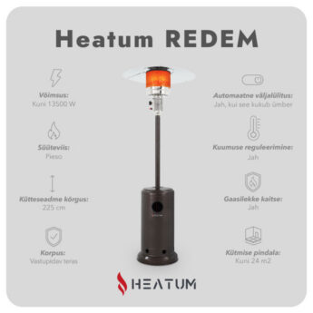 - Heatum Redem kütteseadme konstruktsioon on täiendavalt tugevdatud ja kergesti kokkupandav. Väliskütteseadme valmistamiseks kasutatud värvitud teras on paksem kui enamikul sellisel kujul müüdavaid väliskütteseadmetel. Sel põhjusel võib meie müüdav Heatum Redem kütteseade kaaluga 19 kg olla teistest tootjate seadmetest mitu kilogrammi raskem. Väike kaaluerinevus ei ole sulle transpordi või ümberpaigutamise ajal märgatav, kuid see aitab oluliselt kaasa kütteseadme enda tugevusele ja stabiilsusele, eriti tuulisel päeval.