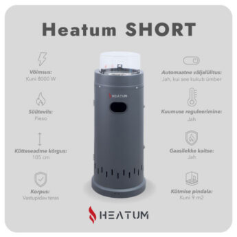 Heatum Short gaasisoojendi on kvaliteetne ja stiilne gaasikütteseade, mis paistab silma oma kompaktse suuruse poolest: see on väiksem kui paljud teised gaasisoojendid. Seetõttu sobib see ideaalselt madalama katusega väliterrassidele, kuhu kõrgemad soojendid ei mahu. Küttekeha on valmistatud täisterasest ja kaetud korrosioonivastase värviga, et tagada gaasisoojendi vastupidavus ja kestvus välitingimustes. Heatum Short mudelit on ohutu kasutada ja seadme valmistamiseks kasutatud materjalid tagavad kõrge kvaliteedi.