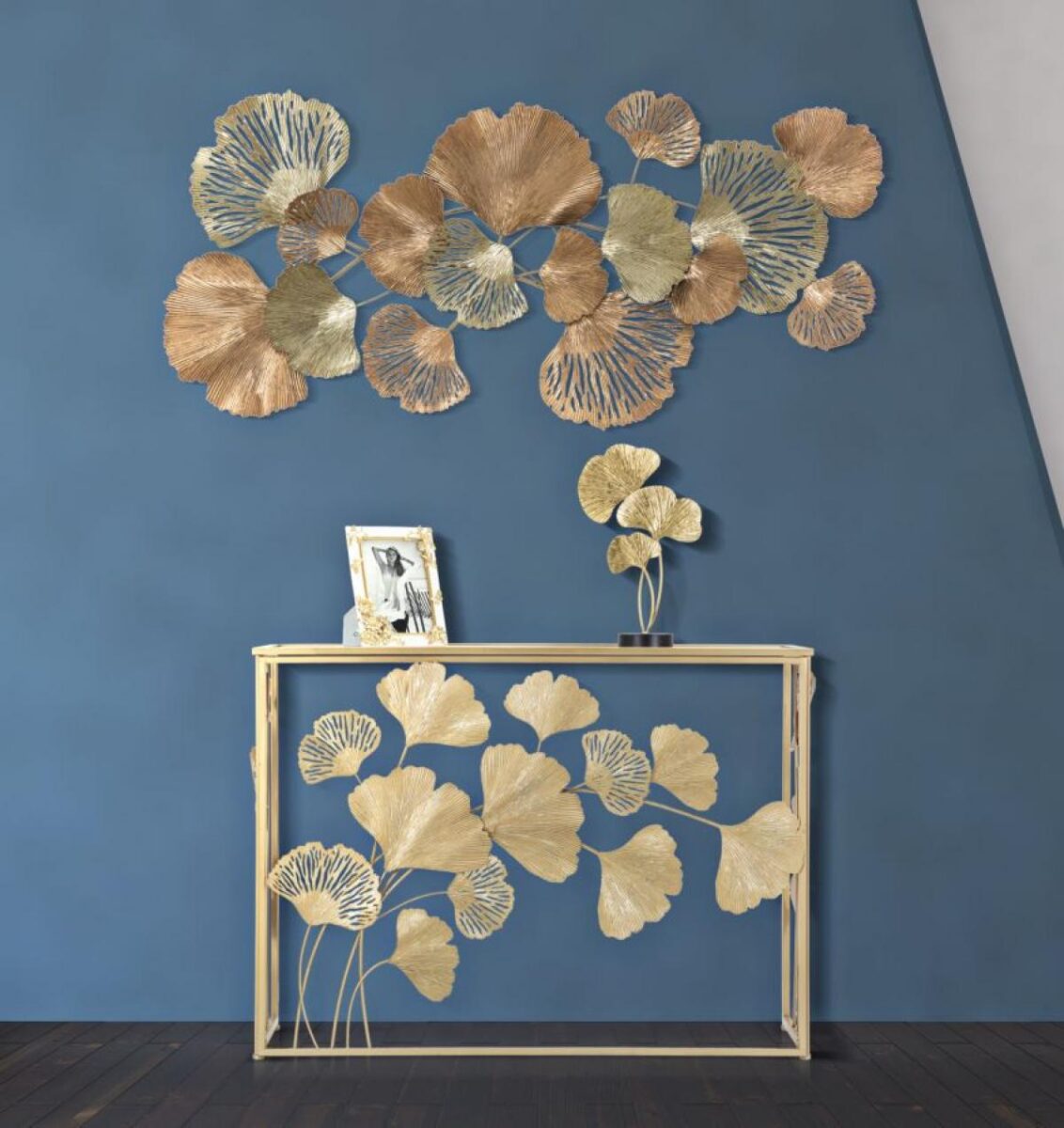 - Kuldne metallist konsoollaud lehekaunistuse ja peegelklaasist pealispinnaga.