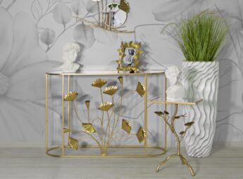 - Kuldne metallist konsoollaud lillekaunistuse ja peegelklaasist pealispinnaga.
