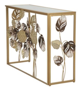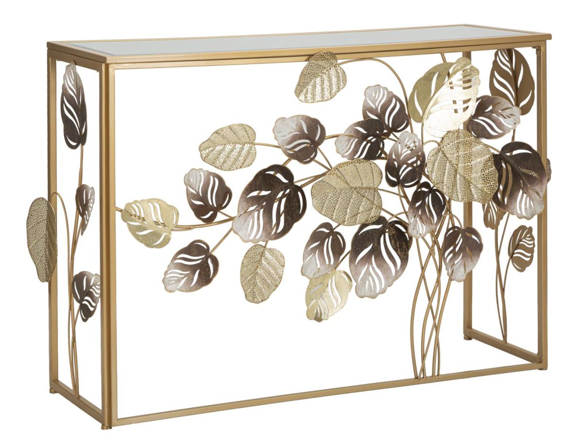 - Kuldne metallist konsoollaud lehekaunistuse ja peegelklaasist pealispinnaga.