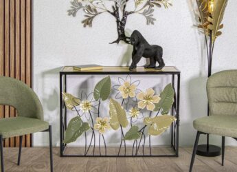 - Musta värvi metallist konsoollaud lehekaunistuse ja MDF-st pealispinnaga.