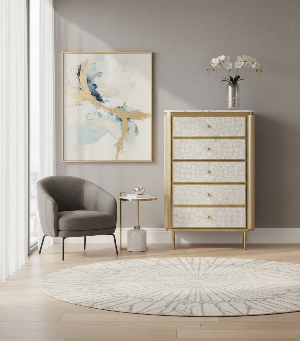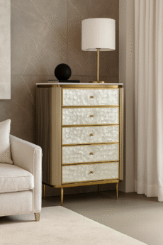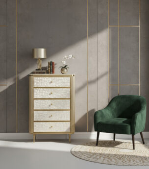 - Stiilne šampanja-kuldne kummut, millel on kuldsed aktsendid ja kuldne alus