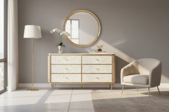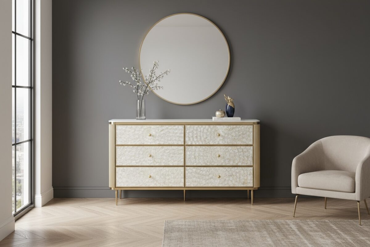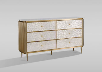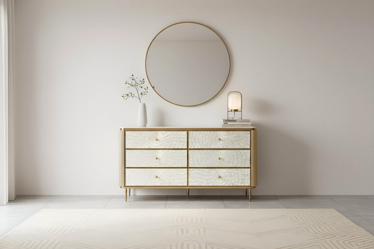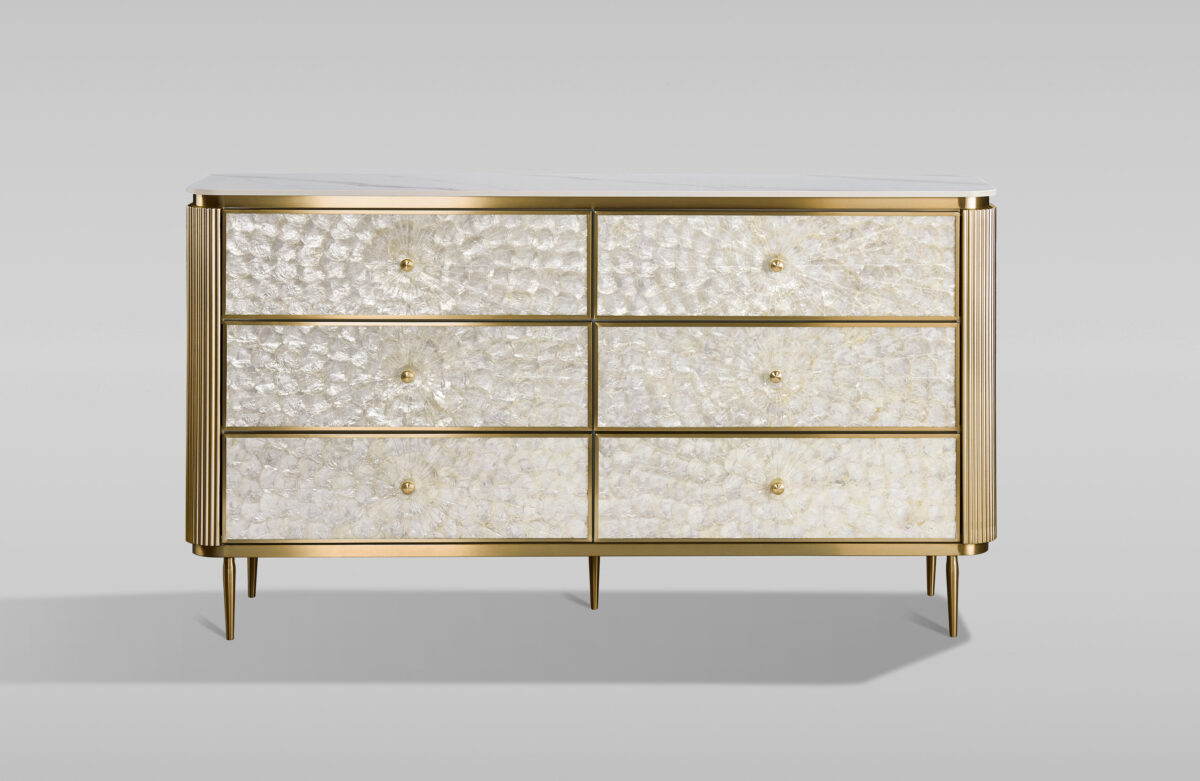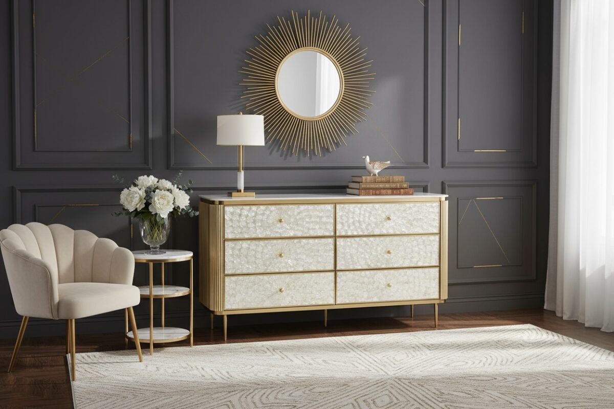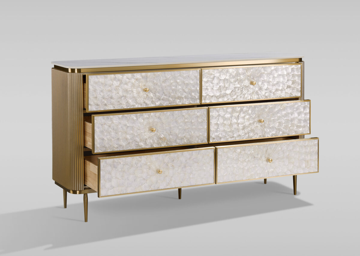 - Stiilne šampanja-kuldne kummut, millel on kuldsed aktsendid ja kuldne alus