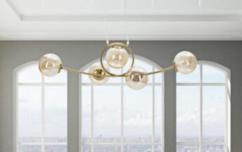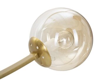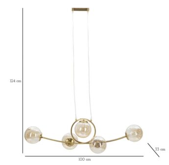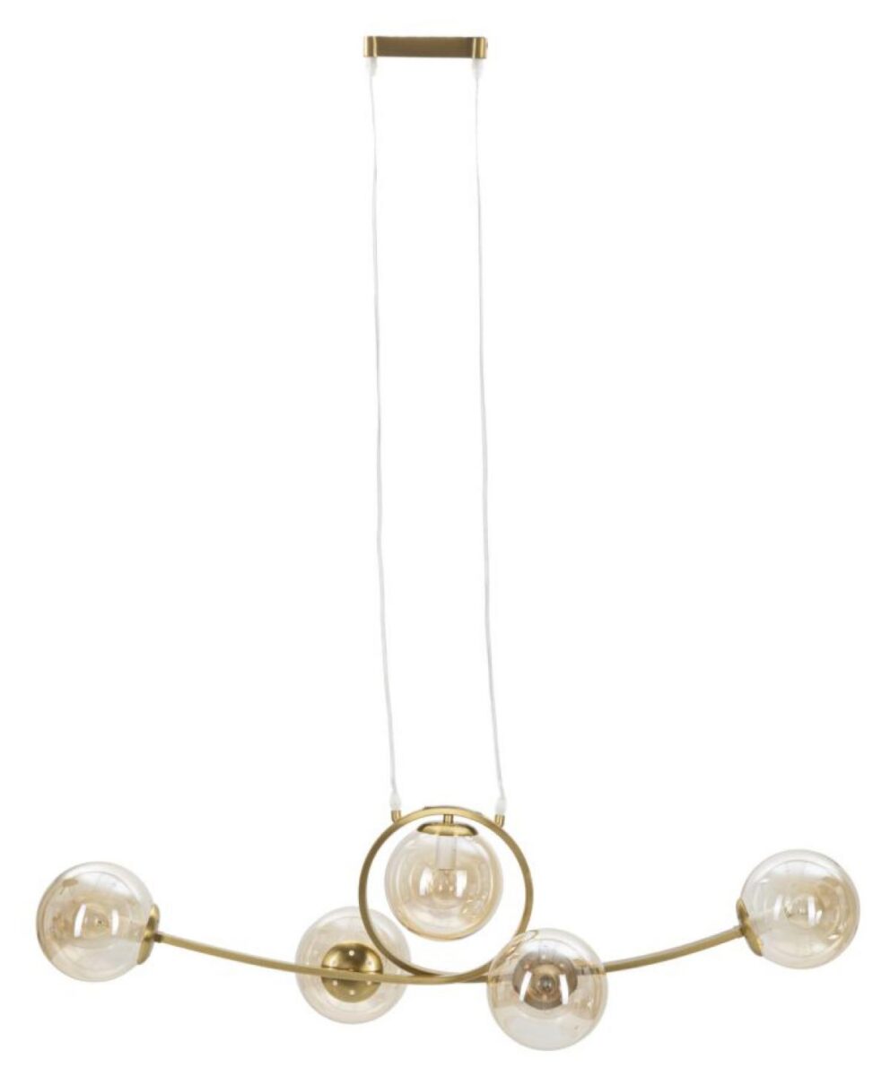 - Kuldne laelamp viie valge klaaskera ja elegantse kujuga.