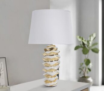 - Valge-kuldne keraamiline laualamp mesitaru mustriga.