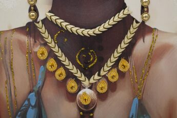 - Naine on kujutatud traditsioonilises riietuses ja turbaniga.