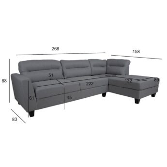 Diivani üldmõõdud on 268×83/158xH88cm. Istme laius 165+57cm, istme sügavus 51/132cm, istme kõrgus 45cm. Käetoe kõrgus maast 61cm.