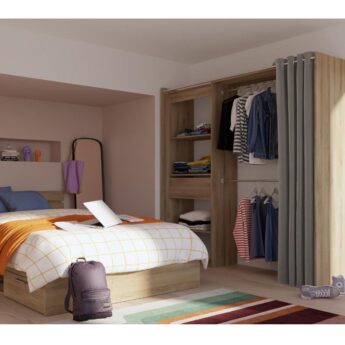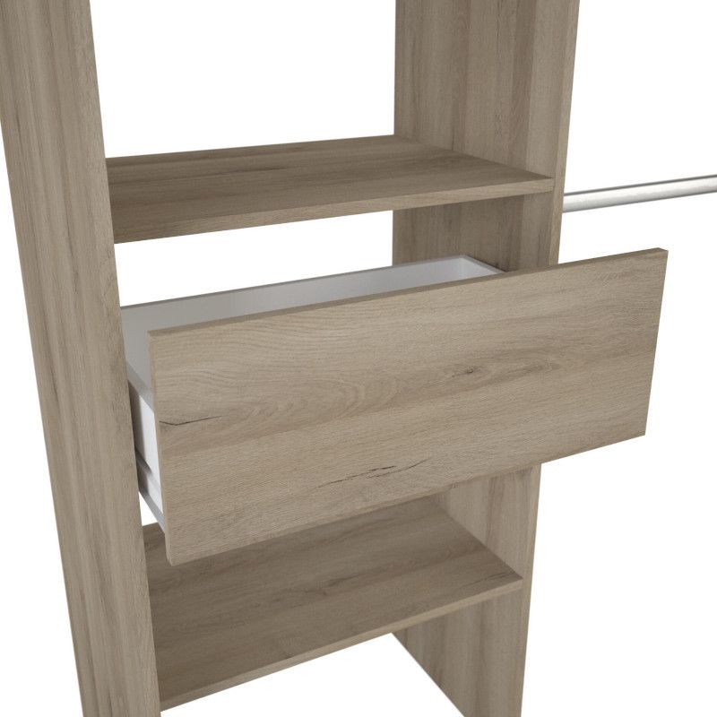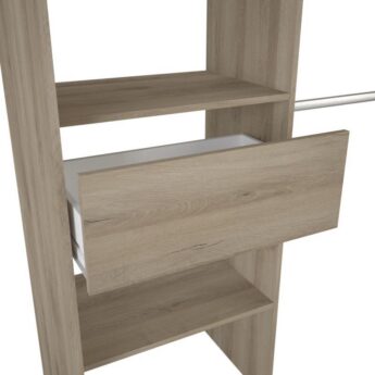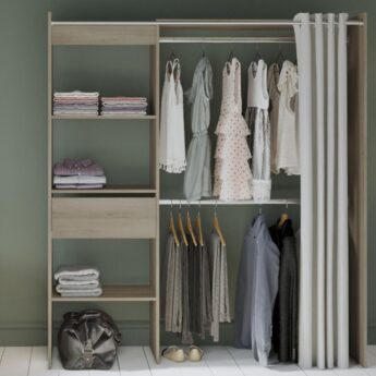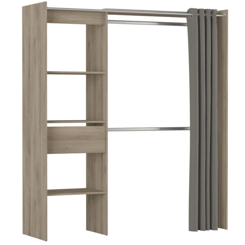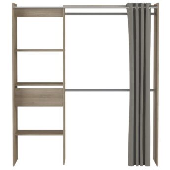 Garderoobisüsteem on pikendatav 114-168 cm. Pikendamine on ülemise plaadi abil, riidepuutoru tuleb ise soovitud mõõtu lõigata. Sellel on kolm fikseeritud riiulit, mõõtmed 57×40 cm, üks sahtel ning kaks metallist riidepuutoru. Komplekti kuulub ka kardin, mis aitab garderoobi sisu vajadusel privaatseks teha.