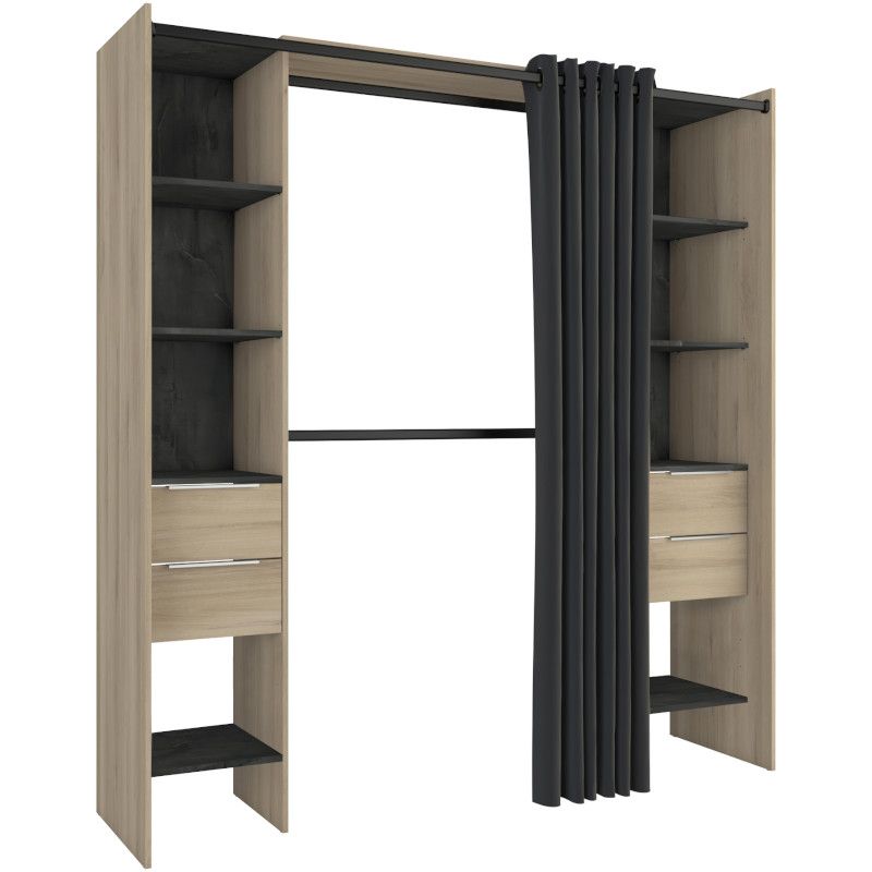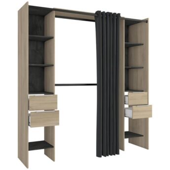 Garderoobil on kaheksa avatud osa, neli sahtlit ning kaks riidepuutoru. See on pikendatav vahemikus 115-190 cm. Pikendamine on ülemise plaadi abil, riidepuutoru tuleb ise soovitud mõõtu lõigata. Komplekti kuulub ka kardin, mis aitab garderoobi sisu vajadusel privaatseks teha.