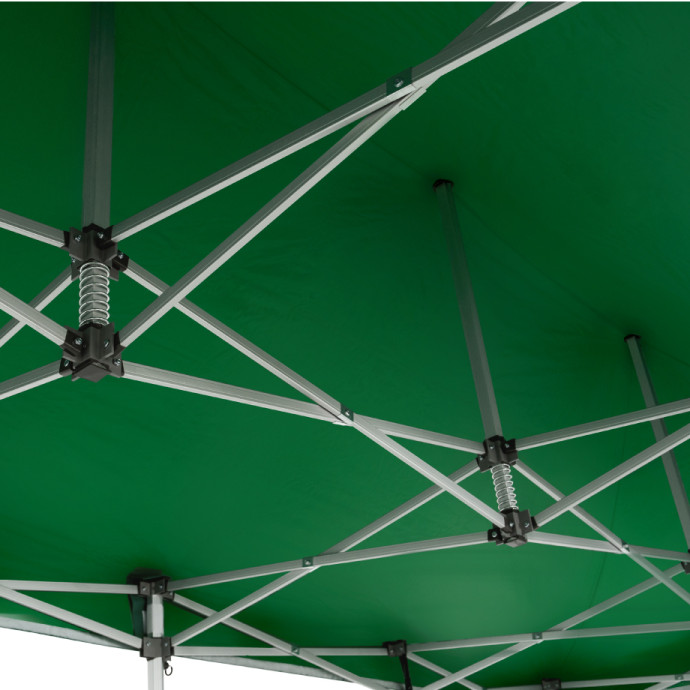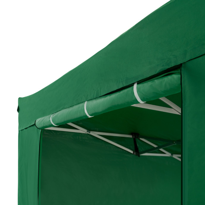 Telgi katuse ja seinte kangas on sertifitseeritud vastavalt Euroopa UV-standardile 801. Telgi koefitsiendi väärtus on 80+. See on valmistatud polüestrist koos täiendava PVC-kattega vastavalt standardile DIN60905. Maksimaalse õmblustugevuse ja niiskuskindluse tagamiseks on kasutatud tööstuslikke õmblustehnikaid. Kokkupandava telgi katuse nurgad on trosside kinnitamiseks aasadega tugevdatud. See tähendab, et saad selle isegi väga halbades ilmastikutingimustes korralikult kinnitada ja tagada telgi stabiilsuse. Telgi seinad ja katus on 100% veekindlad. Katus kinnitatakse konstruktsiooni külge nii takjapaela kui ka täiendavalt lukkudega. Kõik seinad on eraldiseisvad, seega on vajadusel võimalik mõned seinad välja jätta. Seinad kinnitatakse üksteise ja katuse külge takjapaeltega ning seejärel veel eraldi kinnitustega konstruktsiooni külge..