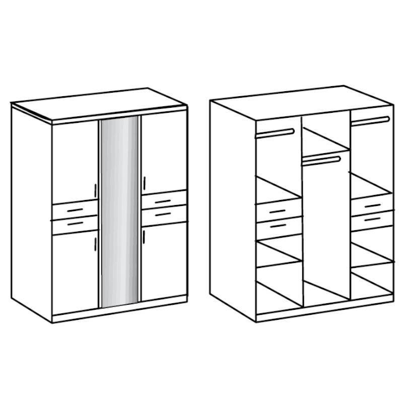 riidepuutoru. Alumiste uste taga mõlemal pool üks vaheriiul. Keskel ülemises osas üks reguleeritava kõrgusega vaheriiul ning riidepuutoru. Käepide on värvitud plastikust.