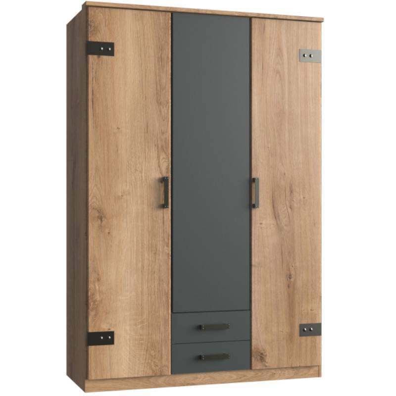 Riidekapp on valmistatud vastupidavast mööbliplaadist ning viimistletud tammeplangu imitatsiooni ja grafiithalli tooniga. Kapi parempoolses küljes on kolm vaheriiulit, vasakul pool kahe ukse taga on ülemine vaheriiul ning riidepuu toru. Kapi alumises osas on kaks sahtlit mugavaks väiksemate asjade hoiustamiseks.