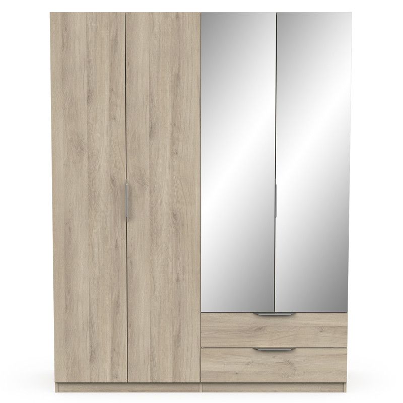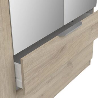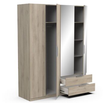 Riidekapp on valmistatud mööbliplaadist. Kapp on mahukas, see on jagatud kaheks osaks. Paremal pool uste taga on kolm vaheriiulit, vasakul pool üks vaheriiul ning riidepuutoru. Alumises osas kaks sahtlit. Kahel uksel olevad peeglid annavad visuaalset avarust ning on praktilised.