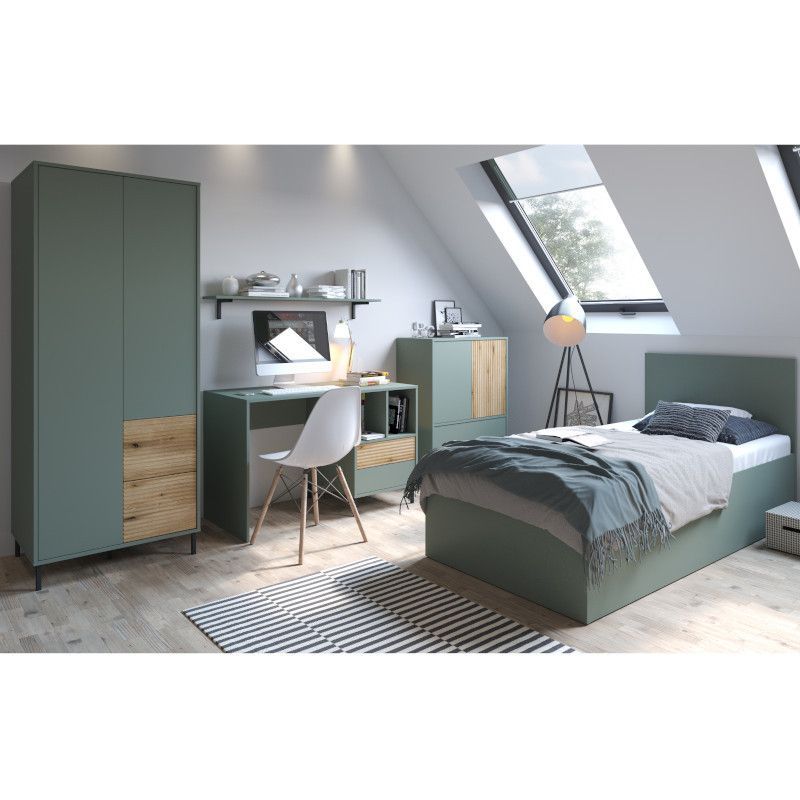 Riidekapp on valmistatud salveirohelises toonis lamineeritud puitlaastplaadist. MDF-ist puitu imiteeriv esiosa on valmistatud soonetehnikas. Kapp on varustatud kahe uksega, vasakul viis vaheriiulit, paremal riidepuutoru ning üks vaheriiul. Uksed ning sahtlid on push-to-open mehhanismiga, mis tagab kasutusmugavuse. Jalad metallist.
