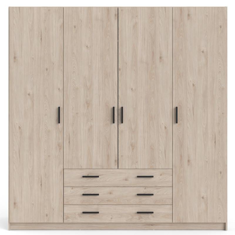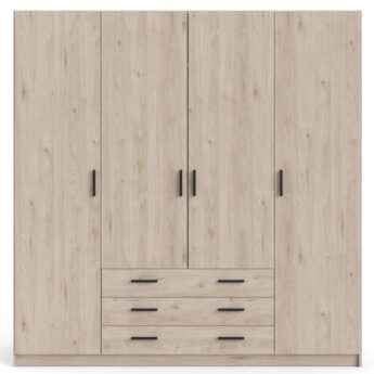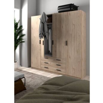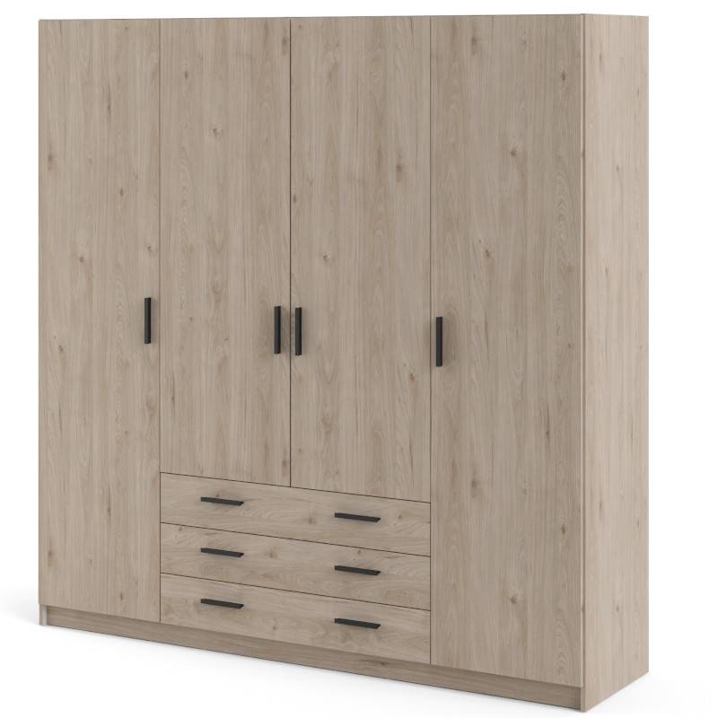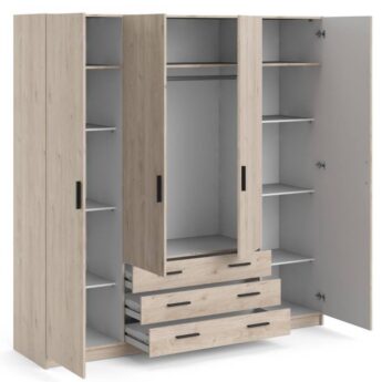 Riidekapp on valmistatud kvaliteetsest mööbliplaadist. Käepidemed on värvitud plastikust. Kapp on jaotatud neljaks osaks. Kahe keskmise ukse taga on ülemises osas riidepuutoru. Äärmiste uste taga mõlemal pool neli reguleeritava kõrgusega vaheriiulit. Kolm sahtlit liiguvad mugavalt metallsiinidel.