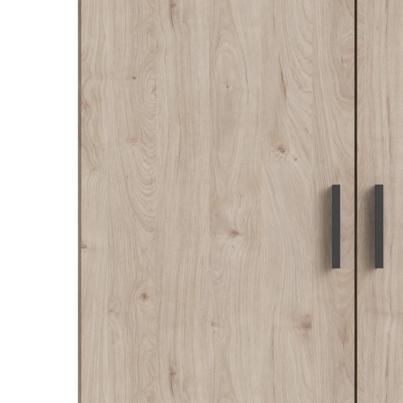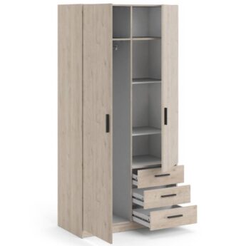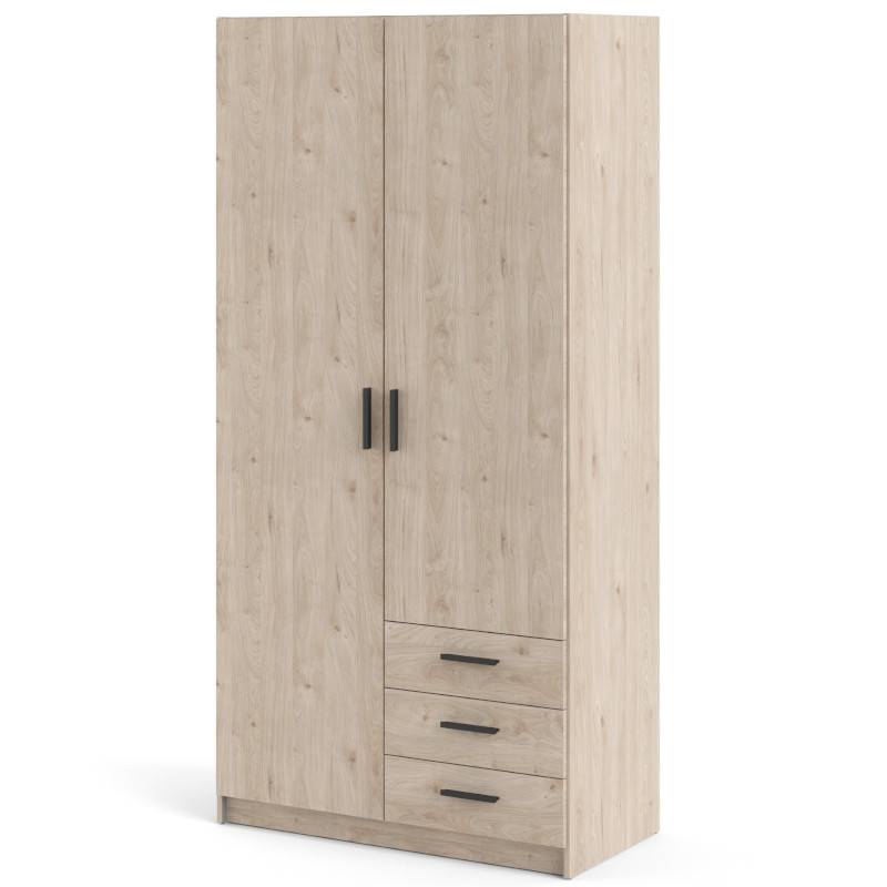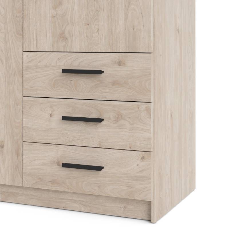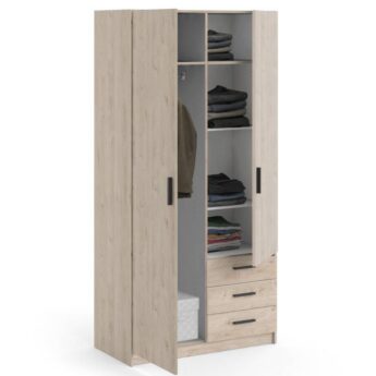 Riidekapp on valmistatud kvaliteetsest mööbliplaadist. Käepidemed on värvitud plastikust. Kapp on kaheks jaotatud, vasakul pool on ülemises osas üks riidepuutoru ning vaheriiul, paremal pool kolm metallsiinidel liikuvat sahtlit ning kolm vaheriiulit.