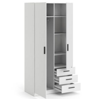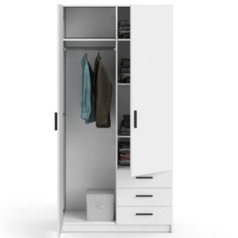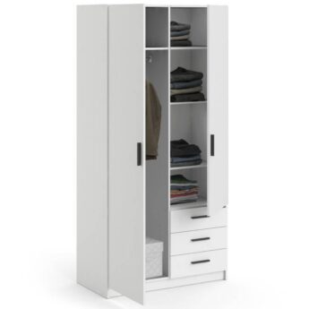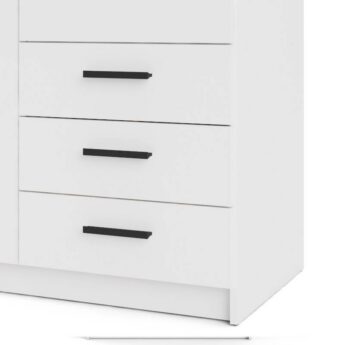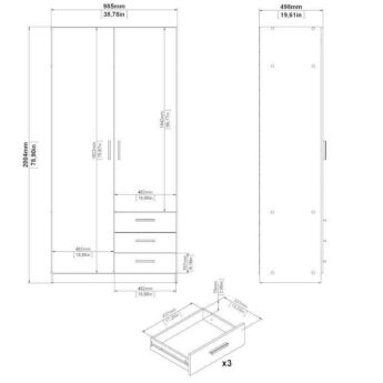 Riidekapp on valmistatud kvaliteetsest mööbliplaadist. Käepidemed on värvitud plastikust. Kapp on kaheks jaotatud, vasakul pool on ülemises osas üks riidepuutoru ning vaheriiul, paremal pool kolm metallsiinidel liikuvat sahtlit ning kolm vaheriiulit.