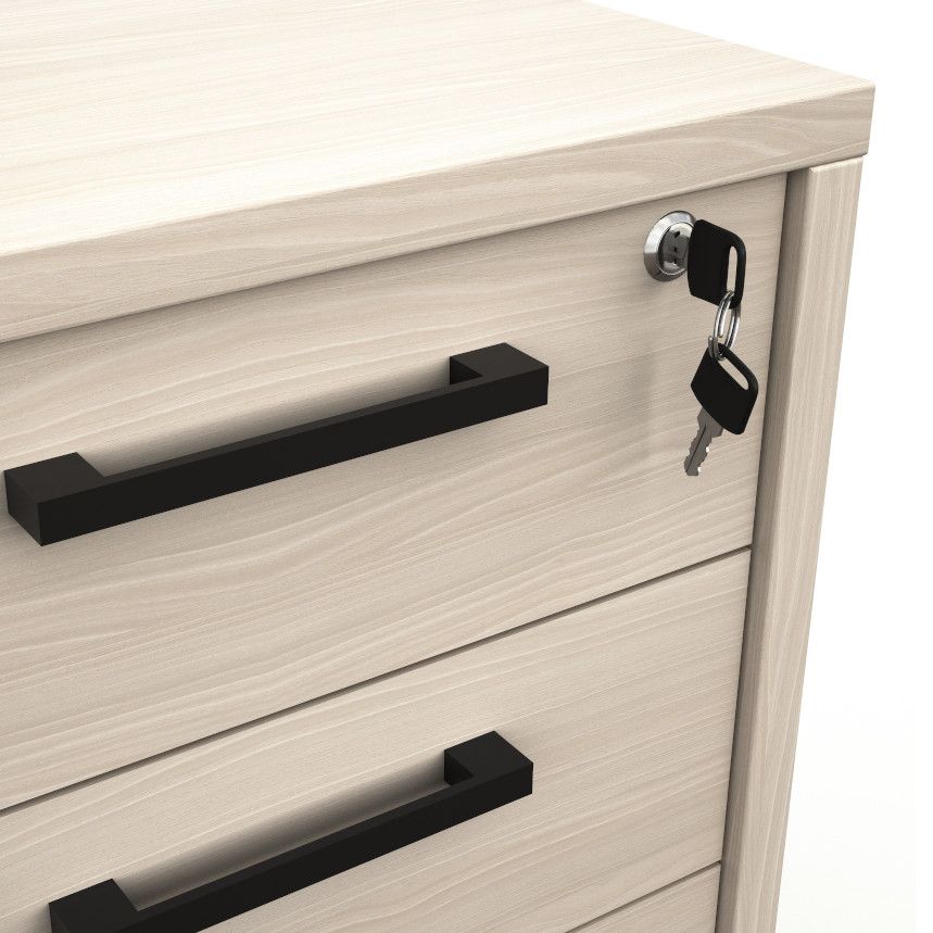 Kogu sarja mööbel on valmistatud tugevast ja vastupidavast melamiinkattega mööbliplaadist, mis tagab pikaajalise kasutusmugavuse ja kvaliteedi. Mööbel on saadaval kahes viimistluses- bolivar puit ning liivatamm. Sahtliboksil on kolm sahtlit, kuhu saad paigutada dokumendid, koolitarbed või muud igapäevased esemed. Tänu ratastele on sahtliboksi lihtne liigutada just sinna, kus seda parajasti vaja on. Esimene sahtel lukustatav.
