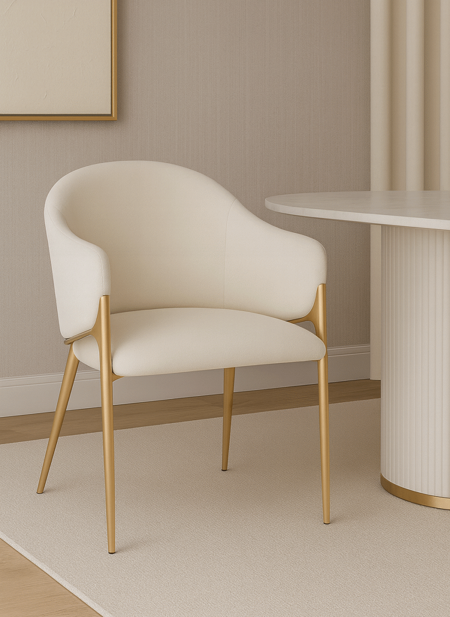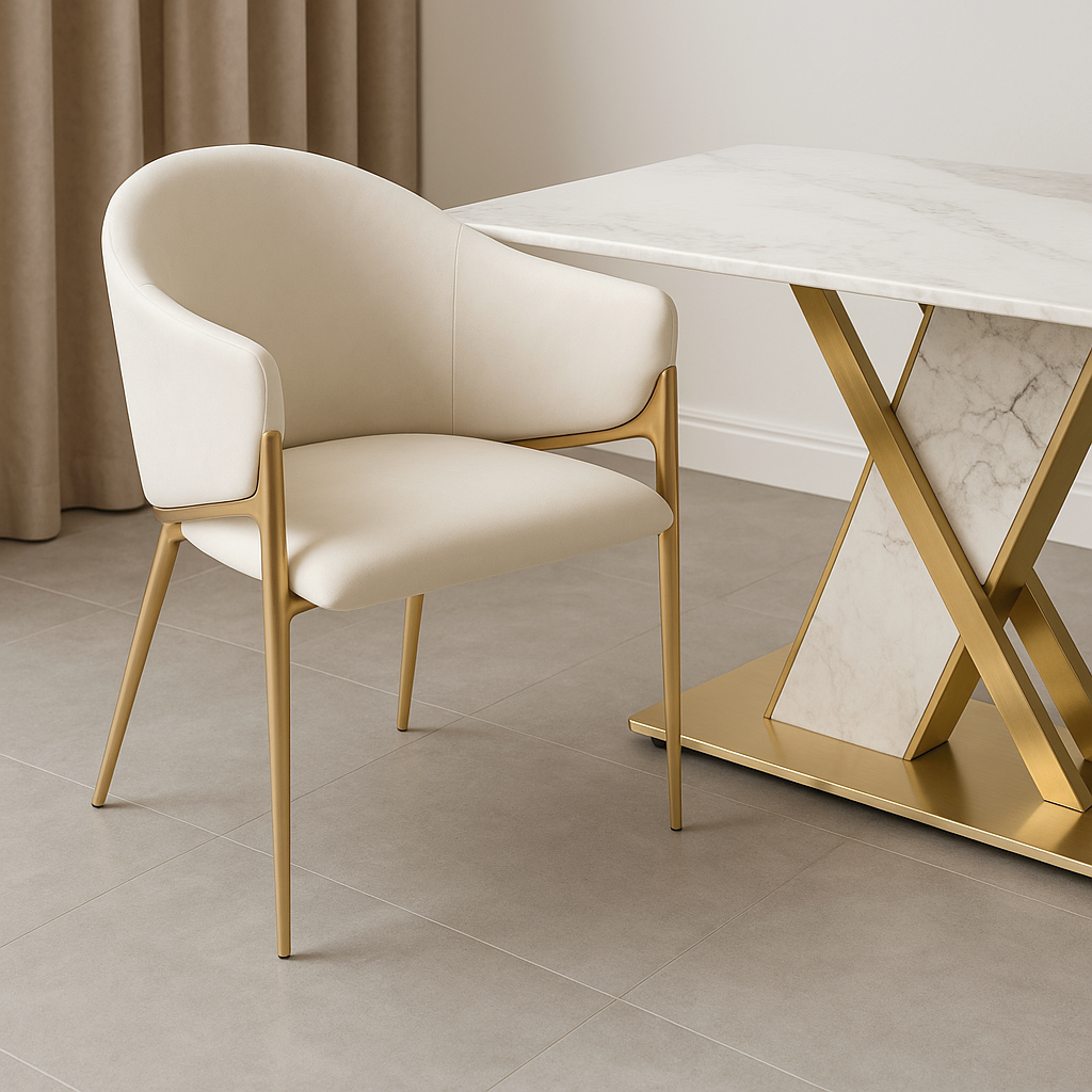 - Glamuurne söögitool kuldse raami, terasjalgade ja valge sametiga
