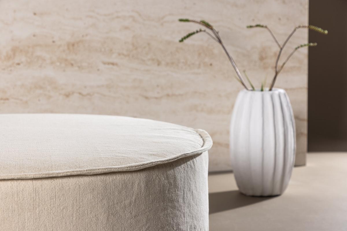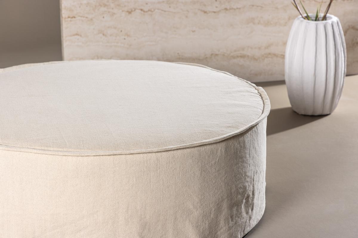 Vindö Ottoman ühendab elegantsi ja funktsionaalsuse, lisades teie kodule modernset stiili. Õrn beež linane kangas ja ümar kuju loovad hubase ja kutsuva ilme. Seda saab kasutada nii jalapingina, lisaistmena kui ka dekoratiivse kohvilauana. Vindö on mitmekülgne ja stiilne mööbliese, mis täiustab igat interjööri.