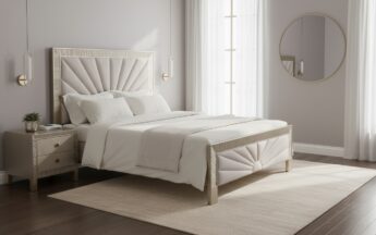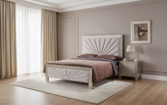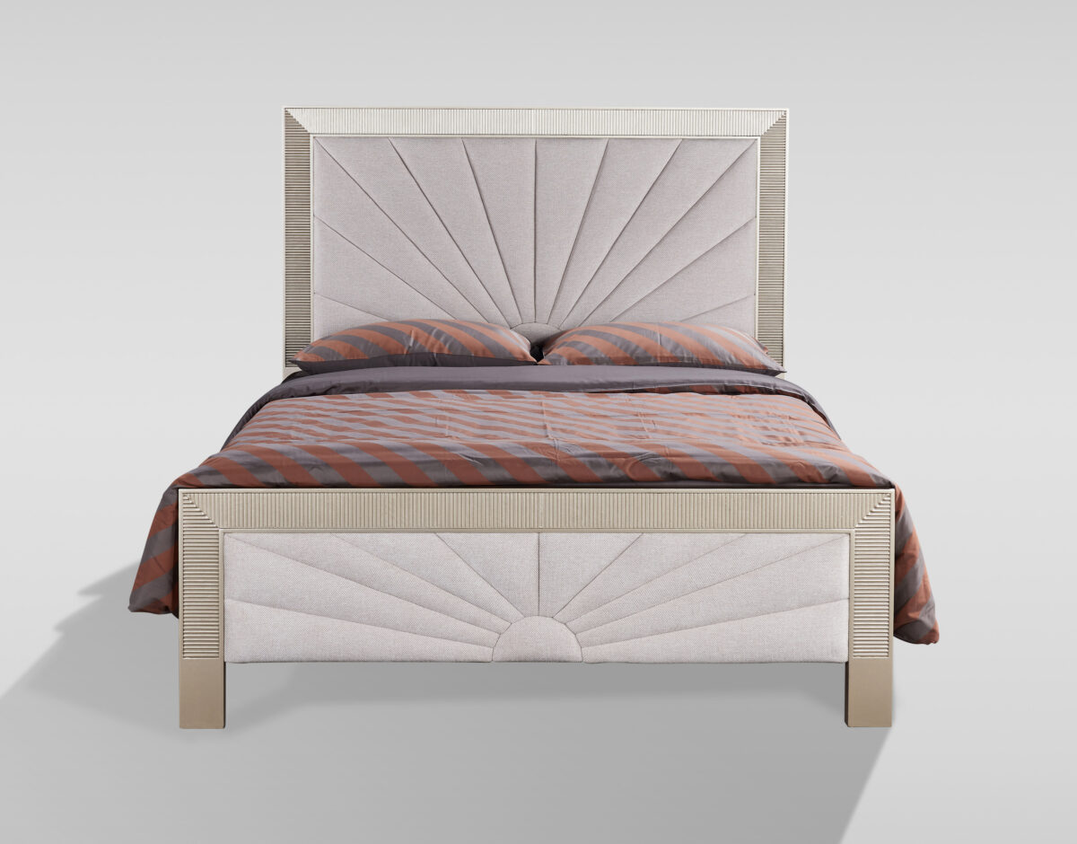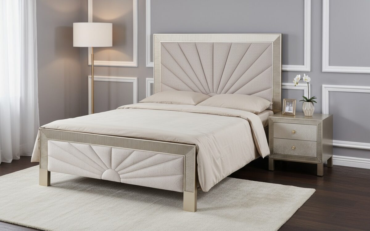 - Moodsas klassikalises stiilis polsterdatud voodi šampanjakuldse tooniga raamiga